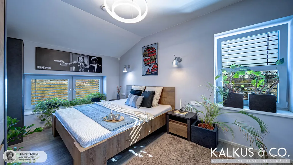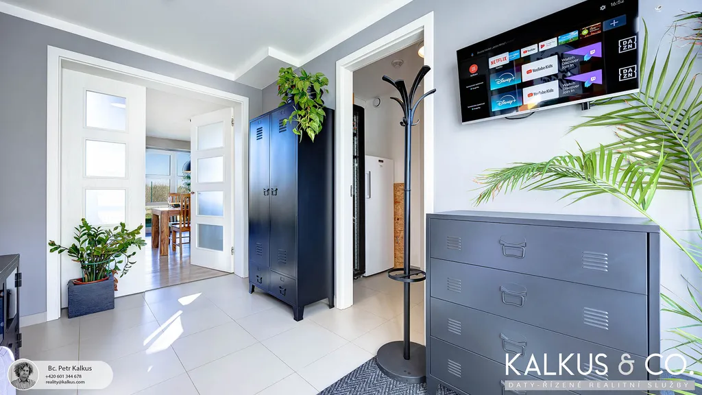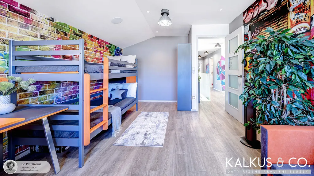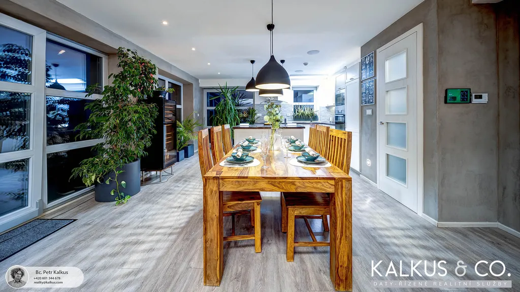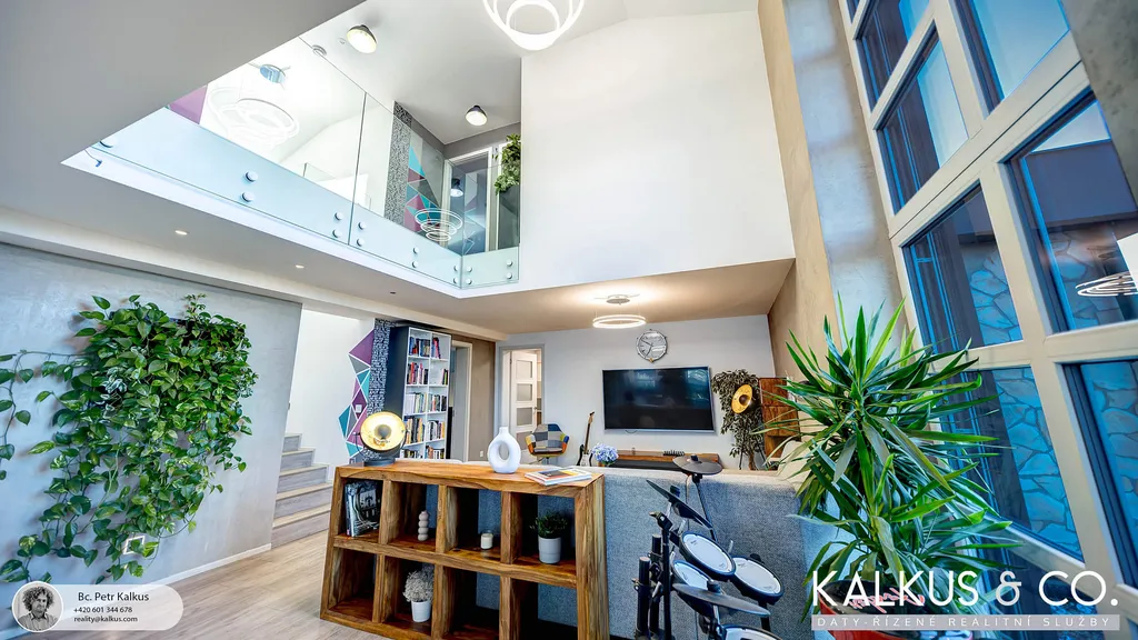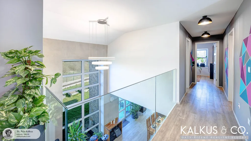S dispozicí 6+kk a užitnou plochou 219 m² na rovinatém pozemku o výměře 1 530 m² nabízí tento dům zázemí i pro větší rodinu. Tři koupelny, wellness místnost s přípravou pro saunu, vysoké stropy a otevřený prostor napříč dvěma podlažími vytvářejí dojem volnosti a vzdušnosti. Děti mají v patře své soukromí, přesto galeriový průhled z horní chodby do obytného prostoru zajišťuje, že rodina zůstává v kontaktu – doslova i symbolicky.