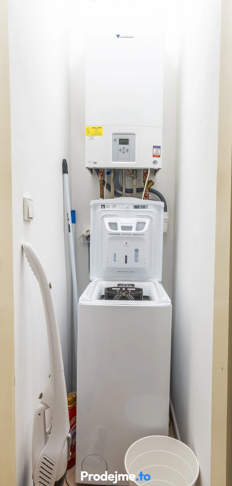 Vytápění i ohřev vody zajišťuje plynový kotel s termostatem a radiátory.
