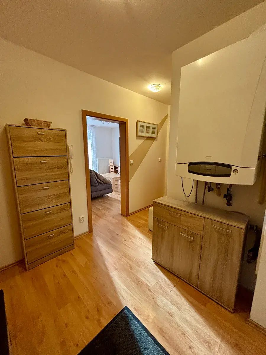 Bytová jednotka disponuje obývacím pokojem s kuch.linkou vybavenou vestavěnými spotřebiči - el. troubou, sklokeramickou varnou deskou, odsavačem par, lednicí s mrazákem, volně stojící myčkou nádobí, mikr.troubou, jídelním stolem se židlemi. V obýv. pokoji se nachází rozkládací sedací souprava, konf.stolek, obývací sestava skříní, stolek na počítač, v ložnici - manželské dvou-lůžko s kvalitními matracemi, šatní skříň, komody – viz fotografie. Z obýv.pokoje i z ložnice jsou vstupy na lodžie. Lodžie z ložnice je zasklená, což umožňuje její využití i v nepříznivém počasí nebo jako zimní zahradu. Byt je velmi světlý orientovaný na JZ, v bytě je dostatek slunečního světla. Okna jsou plastová s předokenními roletami, které zajistí soukromí, termoregulaci a úplné zatemnění. V chodbě jsou botníky, plynový kotel pro ohřev vody a vytápění. Koupelna s vanou se sprchovou zástěnou, pračkou, WC odděleně. Podlahové krytiny - obýv.pokoj s kuch. koutem, ložnice, chodba – plovoucí podlaha, koupelna, WC – dlažba. Bytová jednotka je připravena k nastěhování přelom ledna/února 2026, dle dohody.