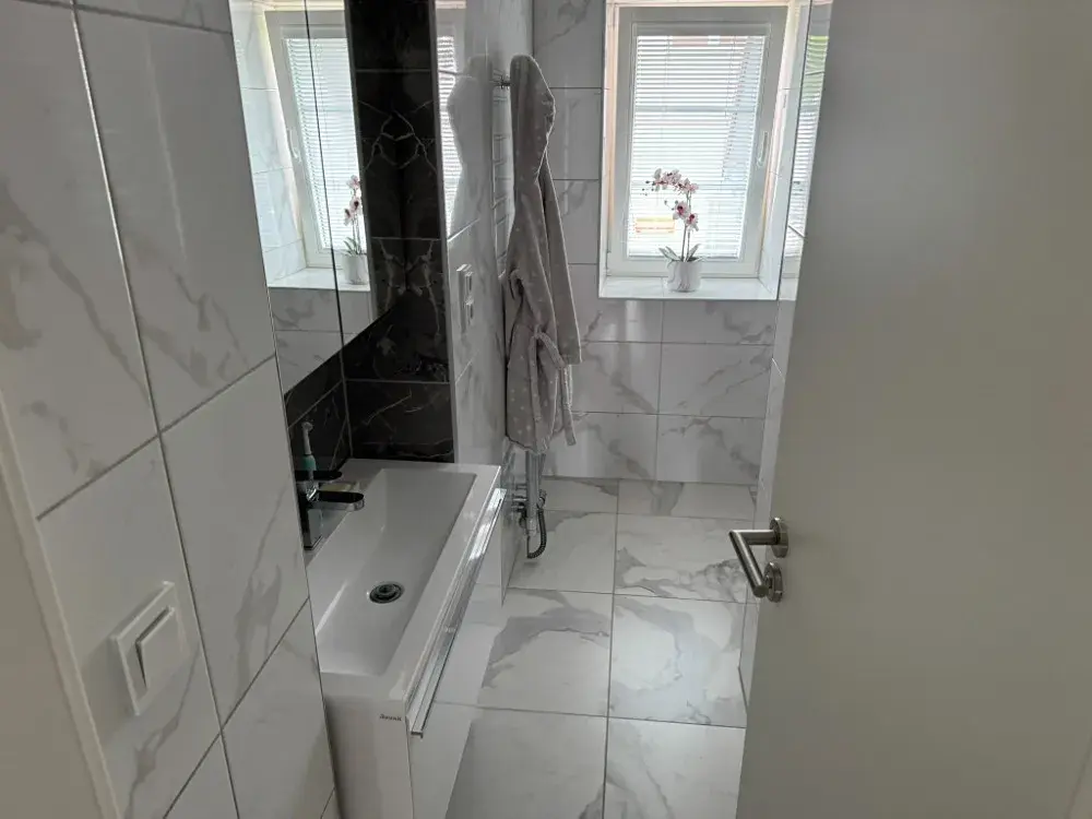koupelně. V interiéru jsou použity současné materiály, například keramické dlažby velkého