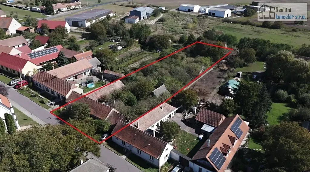 Nemovitost se nachází na pěkném klidném místě na návsi obce, u nově zrekonstruovaného obecního parku s Kaplí sv. Cyrila a Metoděje. Pozemek je přístupný ze dvou protilehlých stran, zasazený v rovinatém terénu. Uliční část domu má severozápadní orientaci, zahrada směřuje na jihovýchod. Pozemek má tvar obdélníku o stranách 26,5 x 111 x 28 x 104 metry. Na uliční severozápadní straně pozemku se nachází rodinný dům s průjezdem a půdorysem tvaru písmene L. Na protilehlé straně pozemku přístupné z obecní cesty stojí zděná stodola s vjezdem o výměře 163 m².