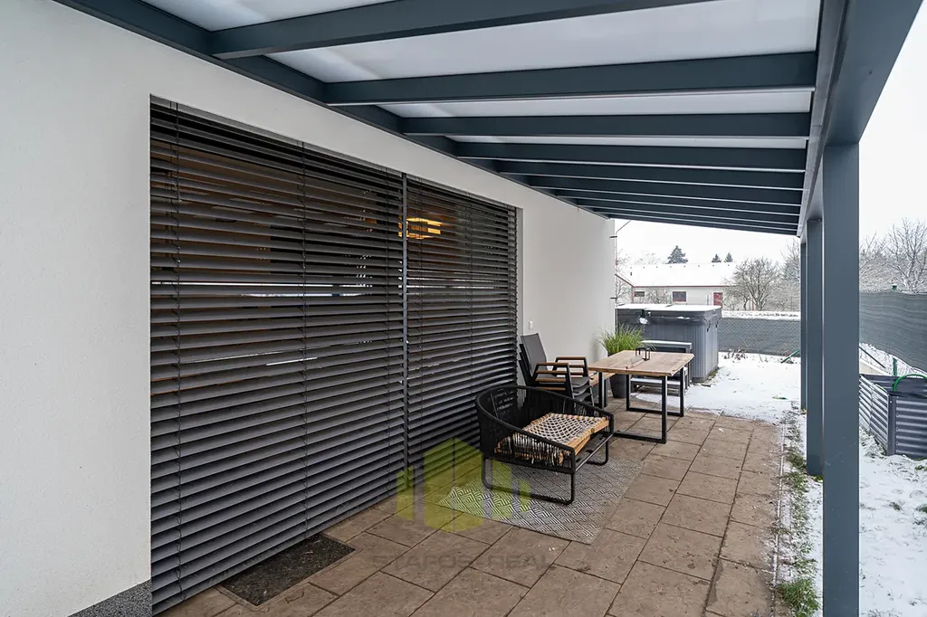 Okna: hliníková trojskla s elektricky ovládanými předokenními žaluziemi NEVA