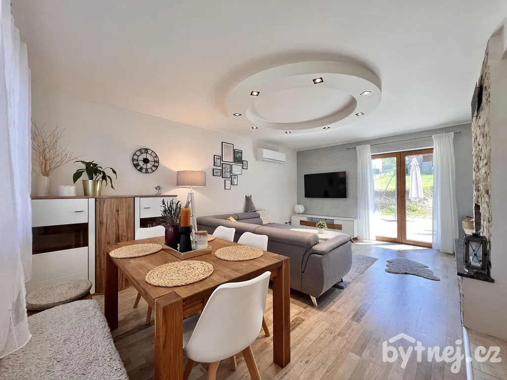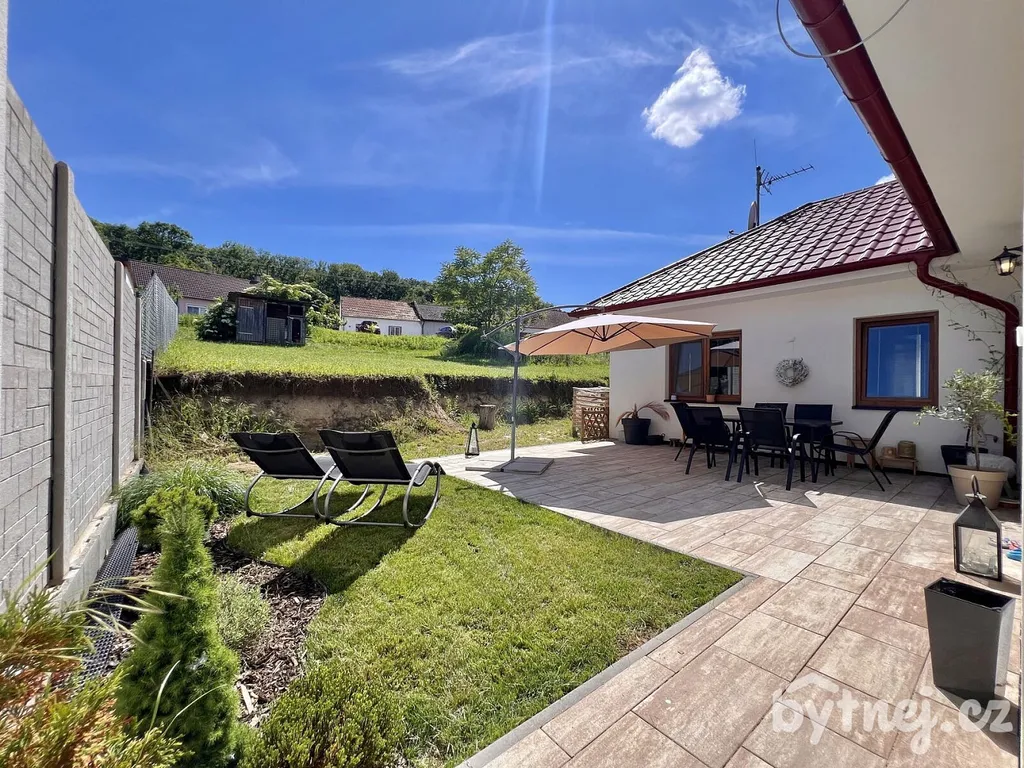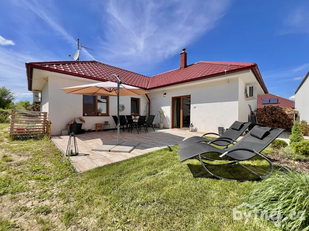 Dům má jedno podlaží s celkovou výměrou 118 m². Sestává ze vstupní chodby, technické místnosti, ložnice, pracovny, samostatného wc, koupelny se sprchovým koutem, pračkou a sušičkou. Dále z dětského pokoje, obýváku s krbem a kuchyně se spotřebiči (lednice, mrazák, myčka, trouba, mikrovlnka, digestoř, varná deska). Z obýváku je vstup na prostornou terasu a zahradu. Veškeré vybavení (i to venkovní) zůstane tak, jak je vidět na fotkách. (Krom dětského pokoje, kde zůstane pouze šatní skříň a poličky).
