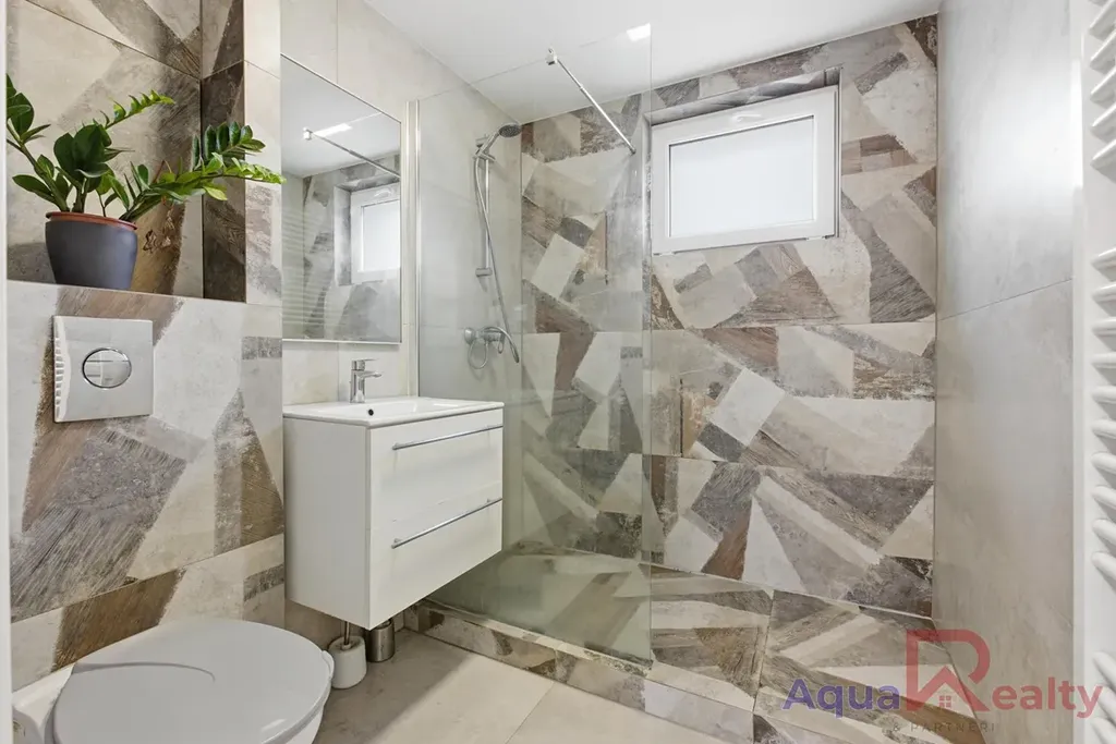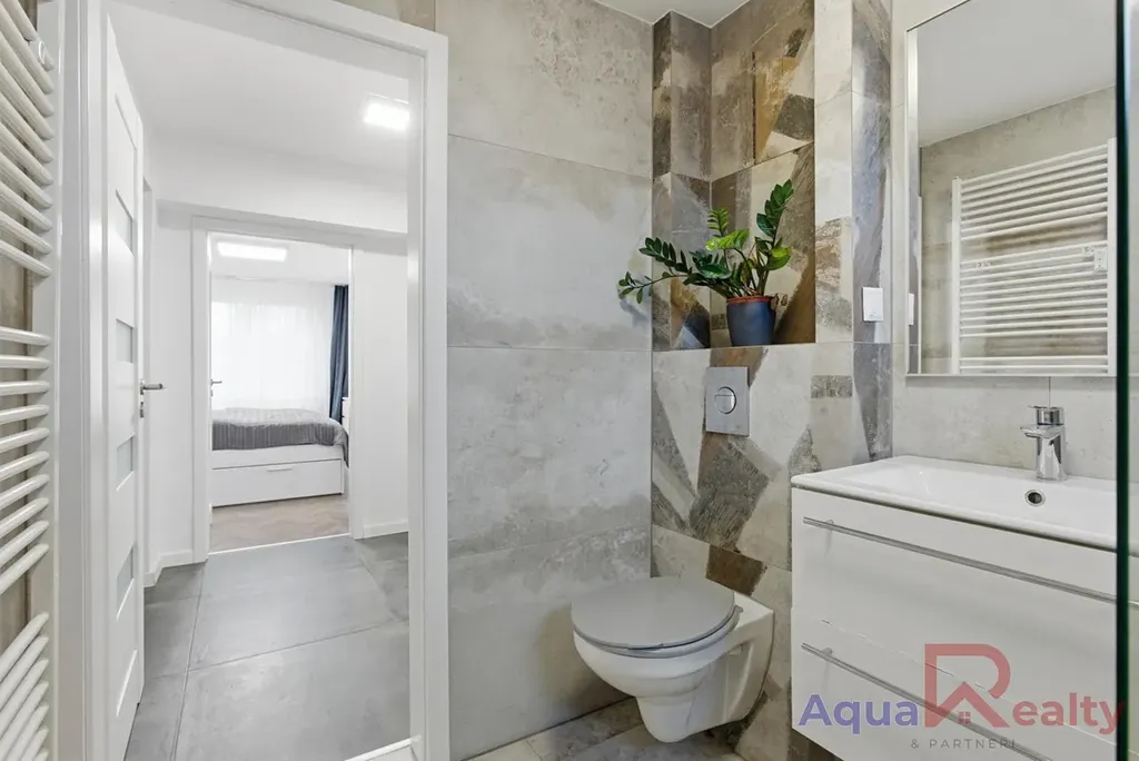 Koupelna je moderně zrekonstruovaná, se sprchovým koutem, umyvadlem s koupelnovou skříňkou, závěsným WC, topným žebříkem a oknem zajišťujícím přirozené větrání. V obytných místnostech jsou položeny kvalitní vinylové podlahy, v koupelně a předsíni keramická dlažba.
