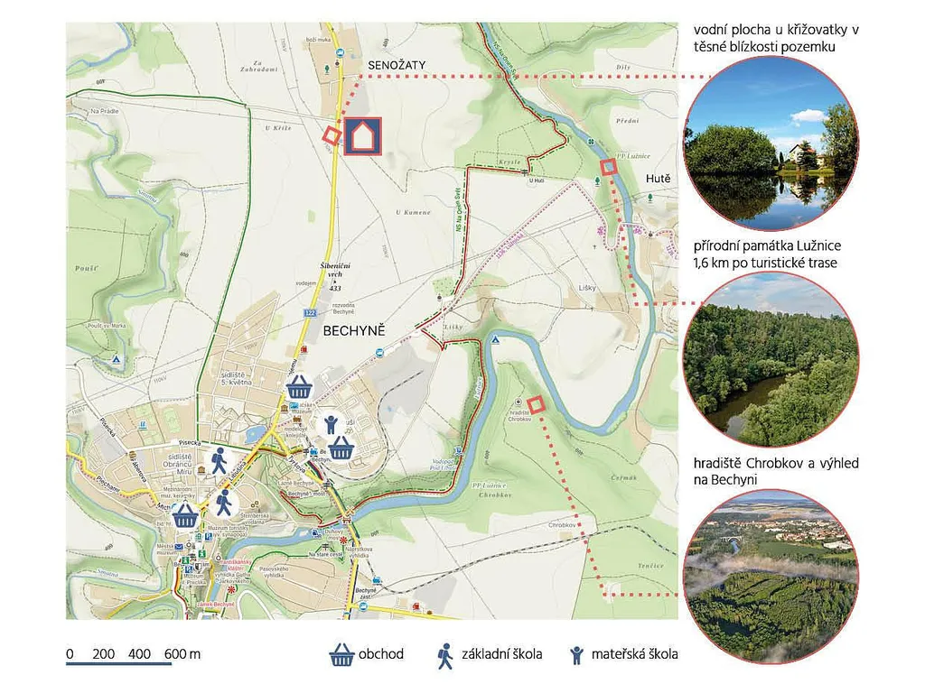 Co se týče okolí, tak vzhledem k poloze pozemků získáváte nejenom klid, ale i velmi dobrou dostupnost do města Bechyně, které se nachází necelé dva kilometry od Vašeho budoucího vysněného domu. Škola, školka, obchody, restaurace, zábava i sportovní aktivity máte na dosah.