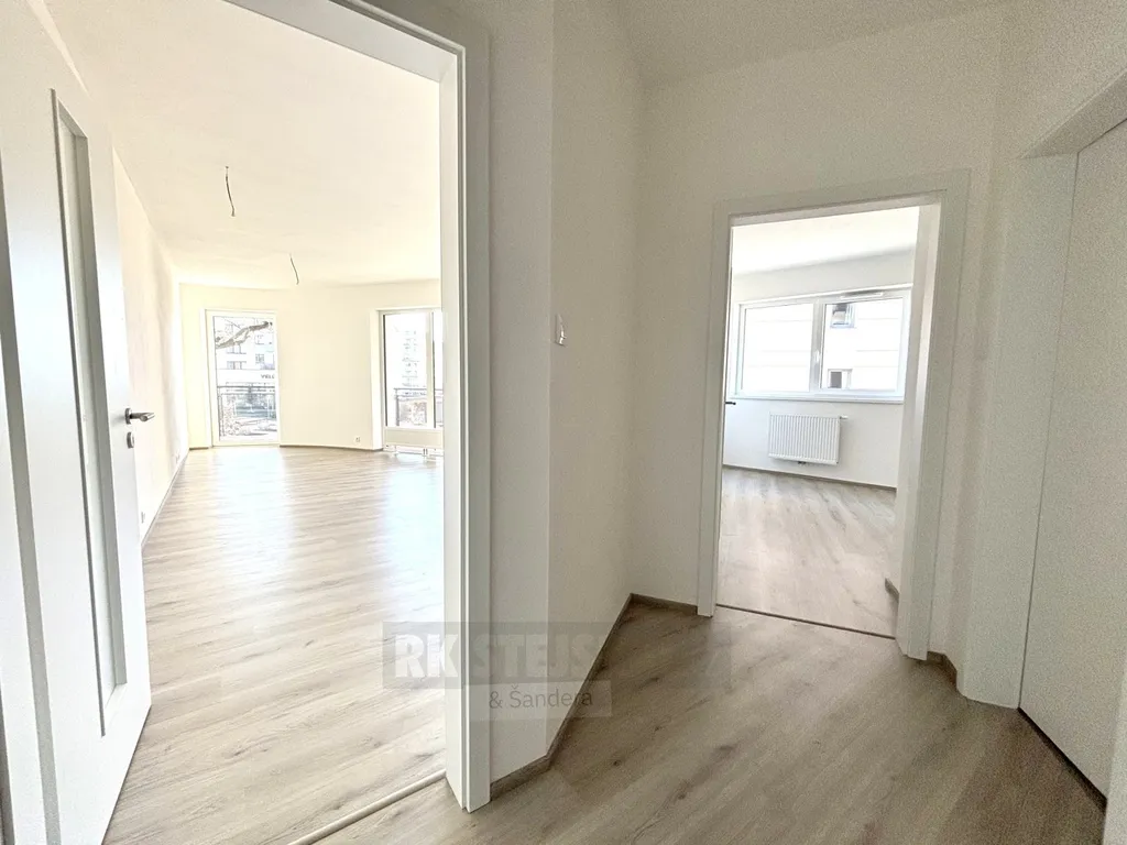 Byt je řešen atypicky, s mimořádným citem pro eleganci a funkčnost. Po vstupu vás přivítá předsíň, kde bude instalována vestavěná skříň a je zde také prakticky vymezený prostor pro umístění pračky a sušičky. Koupelna je sladěna do stylových neutrálních tónů a vybavena vším, co moderní bydlení vyžaduje – vana, toaleta a zrcadlo. Dále prostorná samostatná ložnice s připravenými zásuvkami umístěnými prakticky v dosahu budoucí postele. Dominantou bytu je výjimečně řešený obývací pokoj, který díky velkorysé prosklené ploše nabízí nevšední pocit prostoru, dostatek denního světla, se vstupem na prostorný balkon o ploše 13,3 m², ideální pro venkovní posezení a relaxaci. Kuchyňský kout s plně vybavenou kuchyní včetně spotřebičů – lednice, vestavná trouba, mikrovlnná trouba, myčka nádobí, digestoř. Součástí pronájmu je také parkovací stání - spodní lift parker, a možnost užívání společné kolárny.