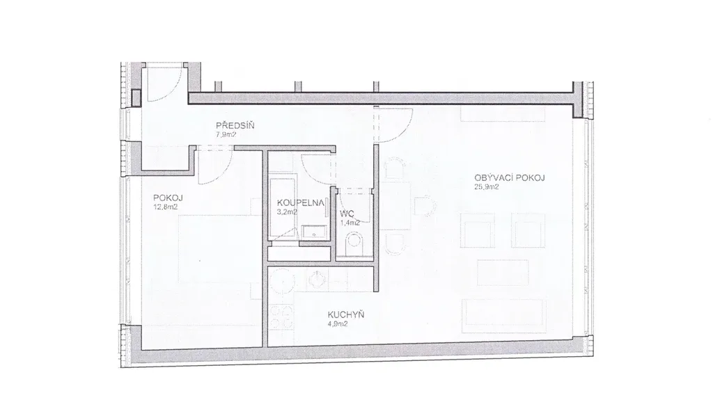 - Byt je vybavený na míru vyrobenou kuchyňskou linkou se všemi spotřebiči (lednička, trouba, sklokeramická deska, myčka, mikrovlnná trouba)