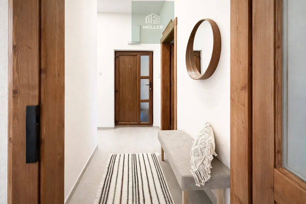 Interiér je výjimečně světlý, klidný a velmi příjemný po celý den. Bydlení zde přirozeně kombinuje atmosféru rodinného domu s komfortem samostatné bytové jednotky.
