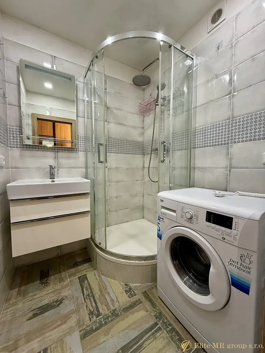 Byt se nachází ve 7. patře sedmipatrového panelového domu s výtahem. Za vstupem do bytu najdete prostornou předsíň s vchodem na samostatné WC, do koupelny se sprchovým koutem, dále do pokoje a do druhého pokoje s kuchyňskou linkou.