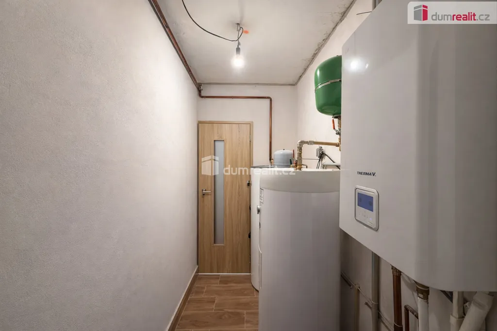 Dominantou technického zázemí domu je tepelné čerpadlo s akumulační nádrží, stáří tři roky, s plně instalovanou venkovní jednotkou zajišťující efektivní vytápění celého domu. Systém je vybaven možností dálkového ovládání. Součástí je nerezový bojler. Veškeré rozvody elektřiny i topení jsou provedeny v mědi. Dům má novou střechu, osazená jsou kvalitní okna s trojskly. K dispozici je technická místnost s přípravou na centrální vysavač. Majitel má navíc k dispozici zateplení domu v podobě polystyrenu o tloušťce 15 cm na polovinu objektu.