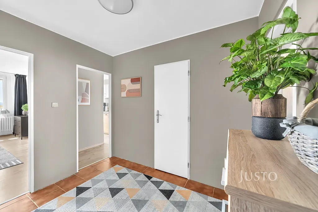 Bydlet budete v 10. nadzemním podlaží revitalizovaného panelového domu s výtahem. Dispozice bytu nabízí neprůchozí pokoje, což zajišťuje soukromí a pohodlí pro všechny členy domácnosti. Světlý obývací pokoj je propojený se vstupem na lodžii, která poskytuje příjemné posezení s jižní orientací a krásným výhledem do okolí. Okna obou ložnic směřují na severní stranu. Kuchyně je vybavena linkou s plynovou varnou deskou, myčkou, lednicí a dostatkem úložného prostoru. Součástí bytu je také praktická komora, která nabízí další místo pro uskladnění věcí. K bytu náleží sklep o ploše 1,5 m², umístěný na stejném patře.