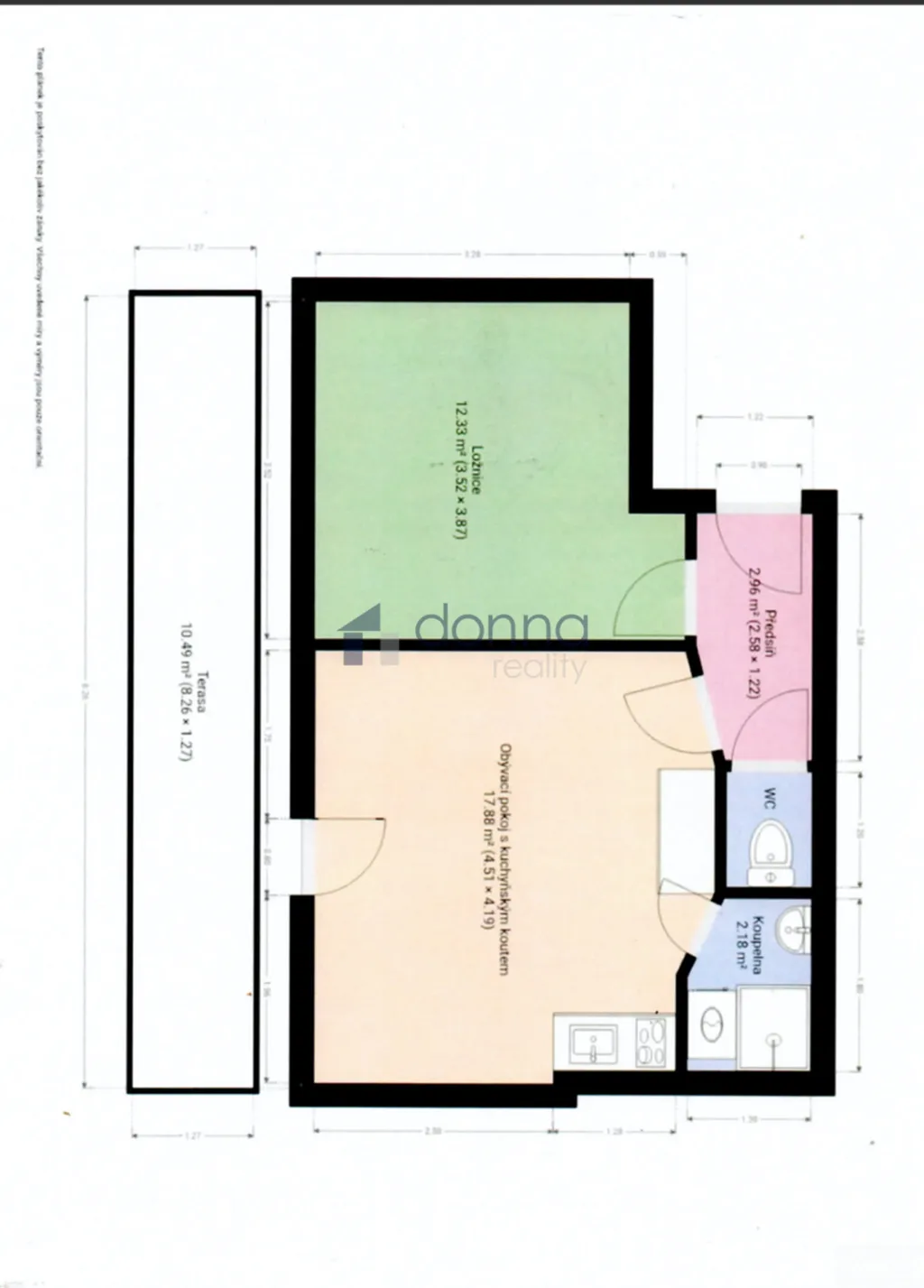 Vstupní chodba, ložnice, pokoj s kuchyňským koutem se spotřebiči (varná deska, malá myčka nádobí, mikrovln. trouba, lednice), jídelní stůl + židle, rozkládací pohovka - lůžko IKEA vč. matrace. Koupelna se sprchovým koutem a pračkou, samostatná toaleta. Topení plynové WAWE.