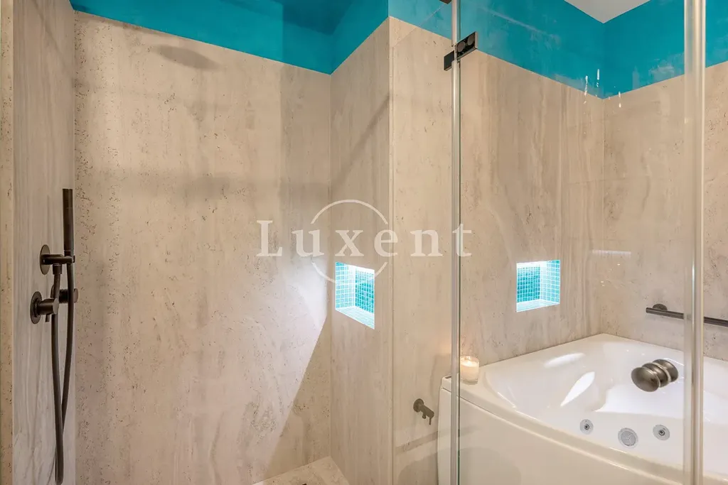 Dispozice zahrnuje obývací pokoj s plně vybaveným kuchyňským koutem a přímým vstupem na předzahrádku. Dále hlavní ložnici s en-suite koupelnou vybavenou sprchovým koutem, masážní vanou, bidetem a toaletou, druhou koupelnu se sprchovým koutem a toaletou a samostatnou pracovnu či druhý pokoj s přístupem do zahrady o výměře cca 80 m², což poskytuje ideální venkovní zázemí a příjemné soukromí přímo u bytu.
