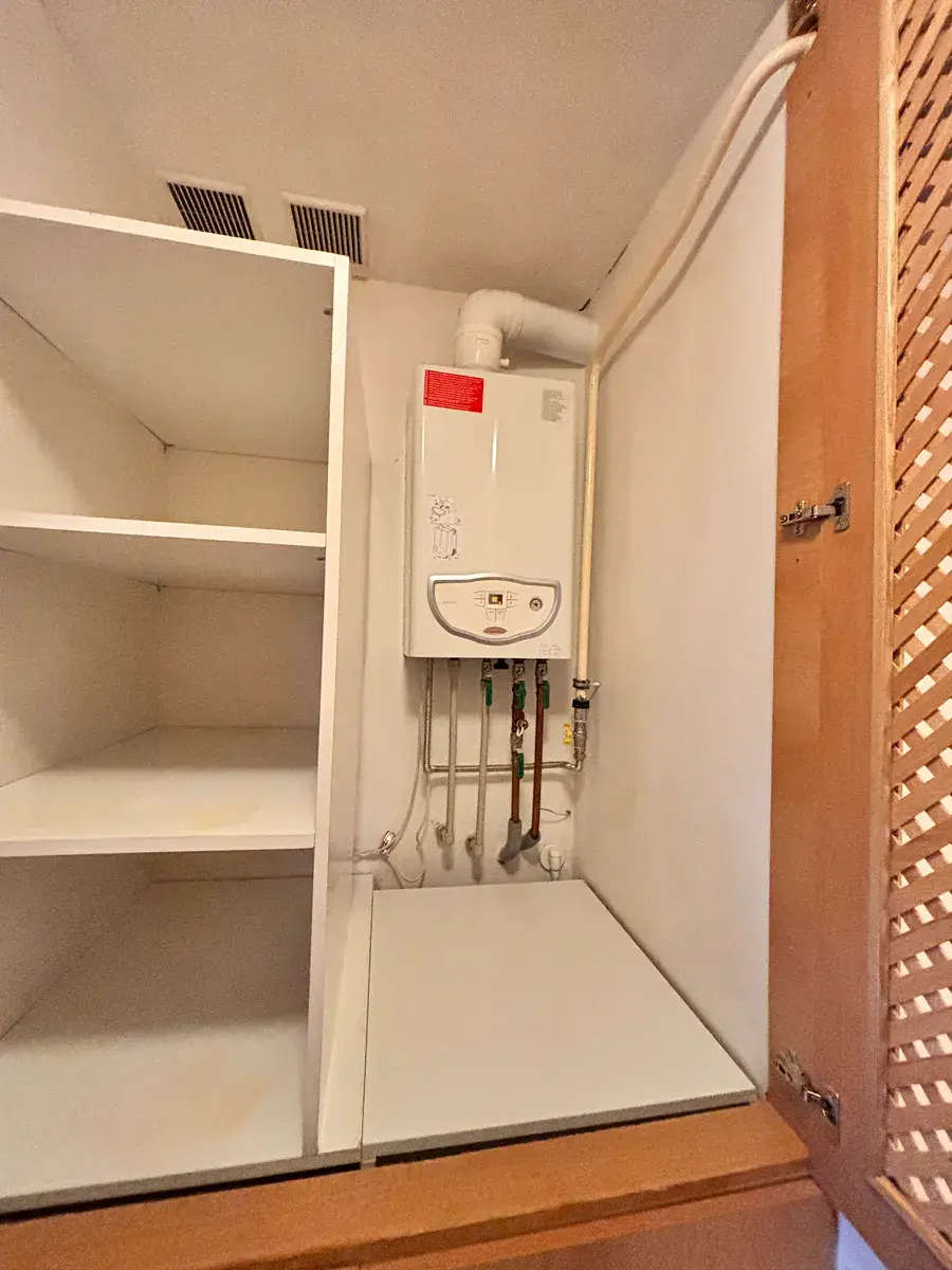 Vytápění bytu a ohřev vody zajišťuje vlastní plynový kotel umístěný v chodbě ve vestavné skříni.
