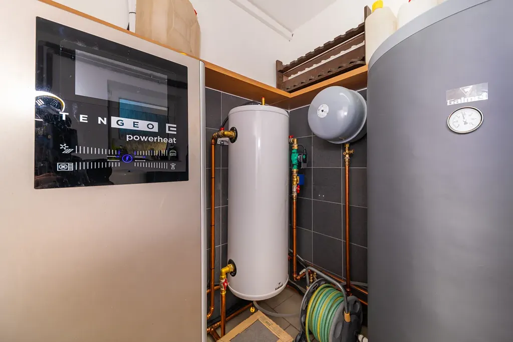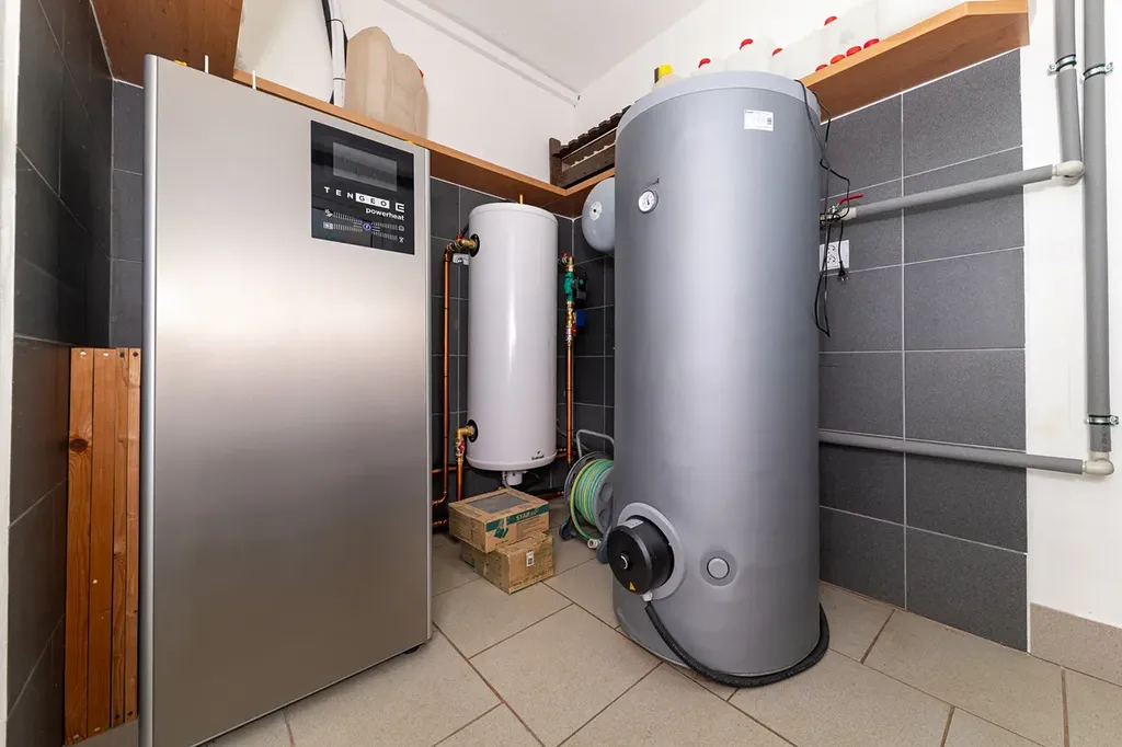 Dům je napojený na vlastní studnu 16 m hlubokou (kombinace vrt + skruže, voda nikdy nedošla, ani při napouštění bazénu), jímka, plyn. Plyn je nyní jen jako záloha k tepelnému čerpadlu. Tepelné čerpadlo zajišťuje topení a ohřev vody v celém domě. Elektřina 220/380V. Zateplení z roku 2020.