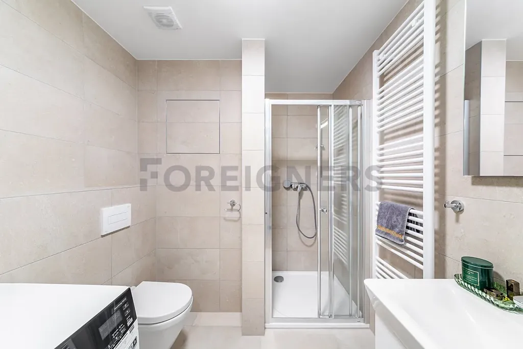 Koupelna s moderním sprchovým koutem, včetně umyvadlové skříňky, s podsvíceným zrcadlem, toaletou a pračkou.