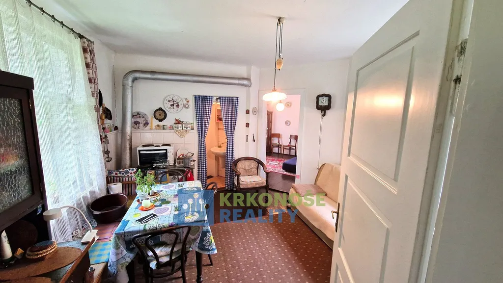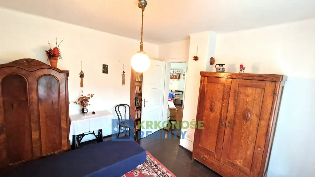 Zděný prostorný dům z roku 1936 působí poctivě a mile – má své příběhy a čeká na další. Uvnitř se nachází přízemí s verandou, kuchyní s jídelním koutem, útulným pokojem, koupelnou s vanou i praktickou kotelnou. Po dřevěném schodišti se vystoupá do podkroví, kde jsou dvě ložnice, předpokoj a malé WC – prostor, kam ranní světlo vstupuje skrze okna s výhledem do korun stromů.