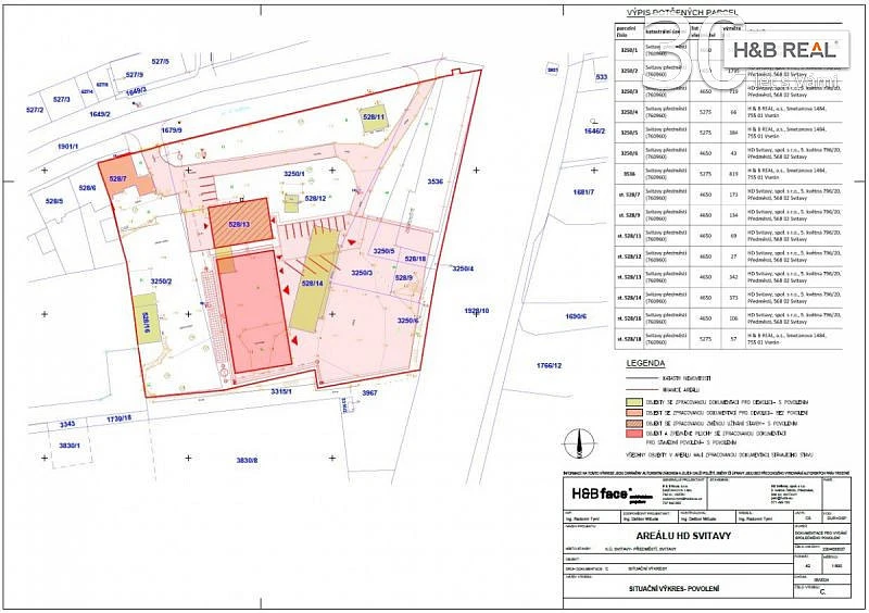 V areálu se nachází několik starších budov (dílny, sklady, administrativa), na většinu z nich je zpracovaná dokumentace bouracích prací a byl vydán souhlas s odstraněním staveb. Pro centrální stavbu v areálu je vyřízeno povolení na změnu užívání stavby na prodejně-administrativní budovu. Součástí povolení je vybudování zpevněné plochy 3.385 m², a na ní umístěné stanové haly 800 m². Aktuálně je po menší či větší rekonstrukci využitelná centrální budova na p. č. 528/13 a skladová hala na p. č. 528/14, v součtu cca 600 m² užitné plochy. Výhodou jsou 2 vjezdy do areálu, umožňující plynulou obslužnost celého areálu.