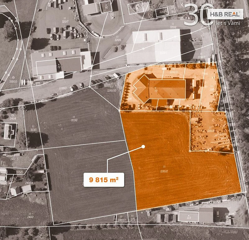 Varianta prodeje B: var. A + navazující pozemek momentálně využívaný jako zemědělská půda, celková výměra 9.815 m².