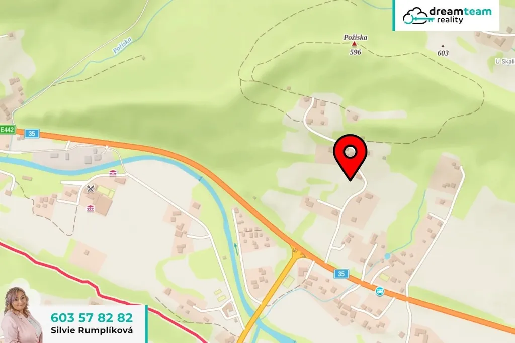 Pozemek leží asi 300 metrů od hlavní silnice, ale 35 metrů nad ní. Díky tomu při grilování na zahradě nevnímáte projíždějící auta, ale přitom máte civilizaci na dosah. Kolem pozemku vede obecní cesta, takže v zimě vám bude sníh odhrnovat obec. Prostě ideální kombinace klidu a dostupnosti.