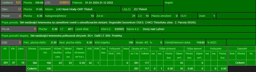 - p.č. 955/63 vedená jako lesní pozemek o celkové výměře 3 483 m2 (stáří lesa 49 let - zastoupení dřevin smrk)