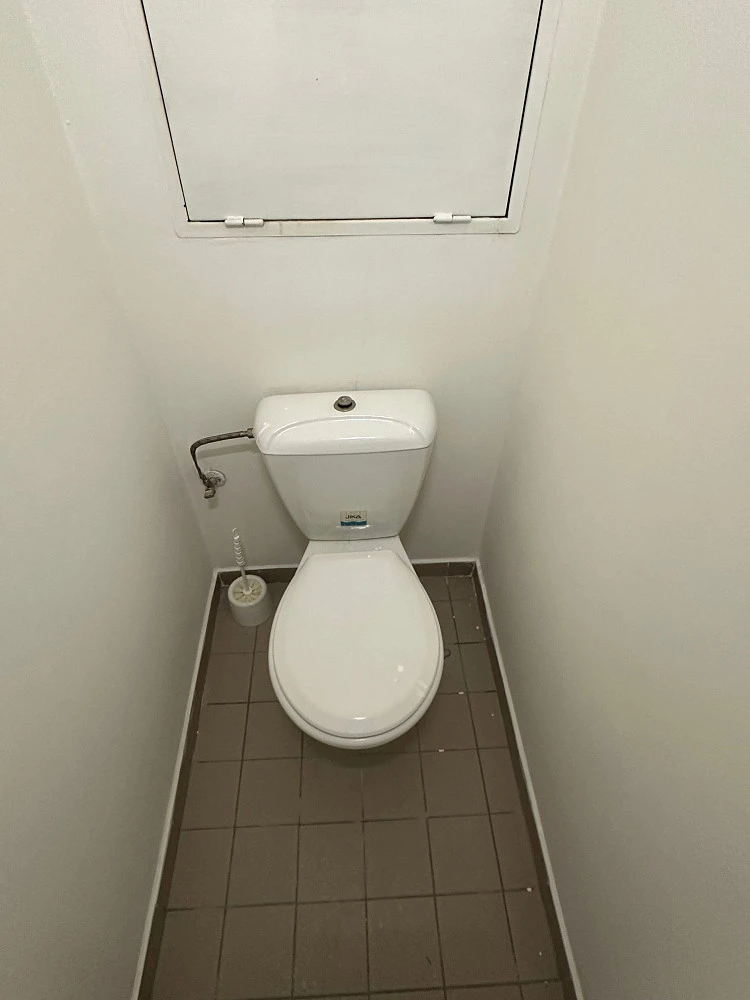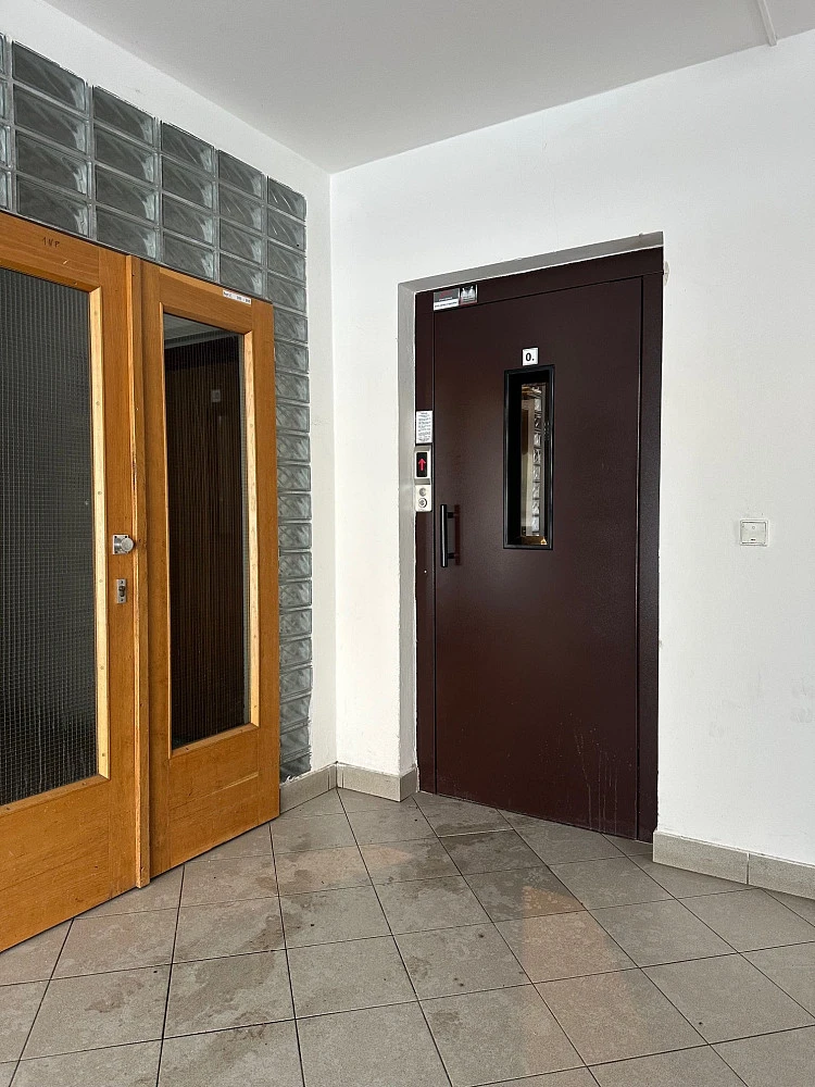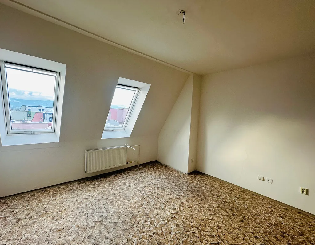 Dispozice bytu - obývací pokoj s kuchyňským koutem (21 m² - zkoseno) + koupelna se zděným sprchovým koutem, přípojka na pračku, samostatné WC, předsíň (6 m²)- pouze dvě střešní okna / plastová z roku 2023, aktuálně nově bíle vymalováno a pečlivě uklizeno. Byt je umístěn na konci uzavřené pavlačové chodby, výtah, sklepní koje.