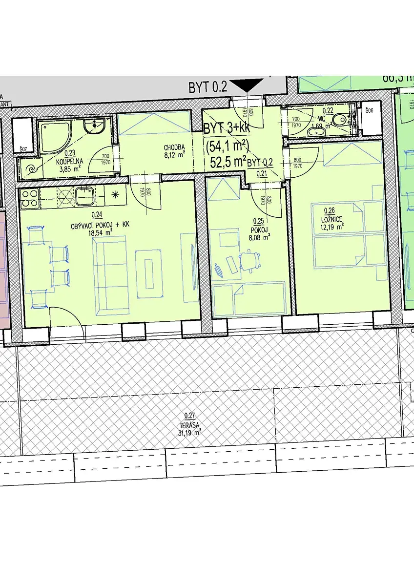 - byt 0.2. - o velikosti 54,10 m2 bez sklepa + terasa 31,19 m2 za cenu 6.960.000,- Kč v 1.PP domu CD22
