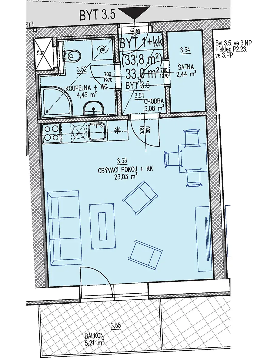 - byt 0.8. bez balkonu o velikosti 34,76 m2 včetně sklepa za cenu 3.959.900,- Kč v 1.PP domu CD22