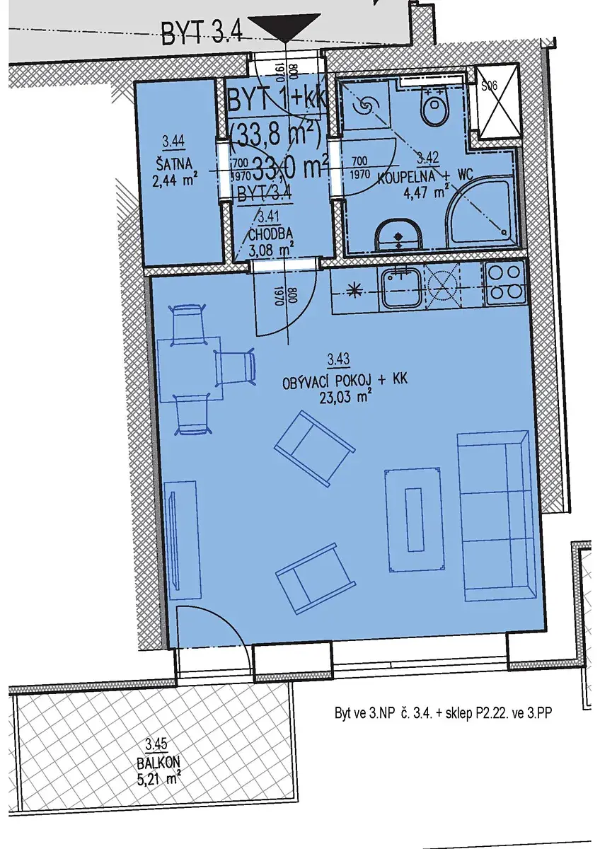 - byt 3.4. o velikosti 36,32 m2 včetně sklepa + balkon 5,21 m2 za cenu 4.773.800,- Kč ve 3.NP domu CD22
