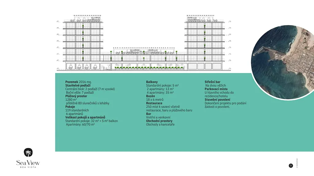 Projekt počítá s centrální budovou sestávající ze 2 pater, každé patro o výšce 7 m, a dvou bočních věží o 7 patrech, se střešními bary. Hotel se bude skládat ze 119 standardních pokojů a 6 apartmánů a také bazénu o rozměrech 18×6 metrů. Součástí projektu je také restaurace s 250 místy k sezení (včetně restaurace, baru a plážového baru), bar (vnitřní i vnější) a obchodní prostory (obchody a kanceláře). Parkovací místa jsou vyznačena před hlavním vchodem rezidence. Dále je zde koncese na pláž o rozloze 1280 m2 s 80 lehátky se slunečníky.