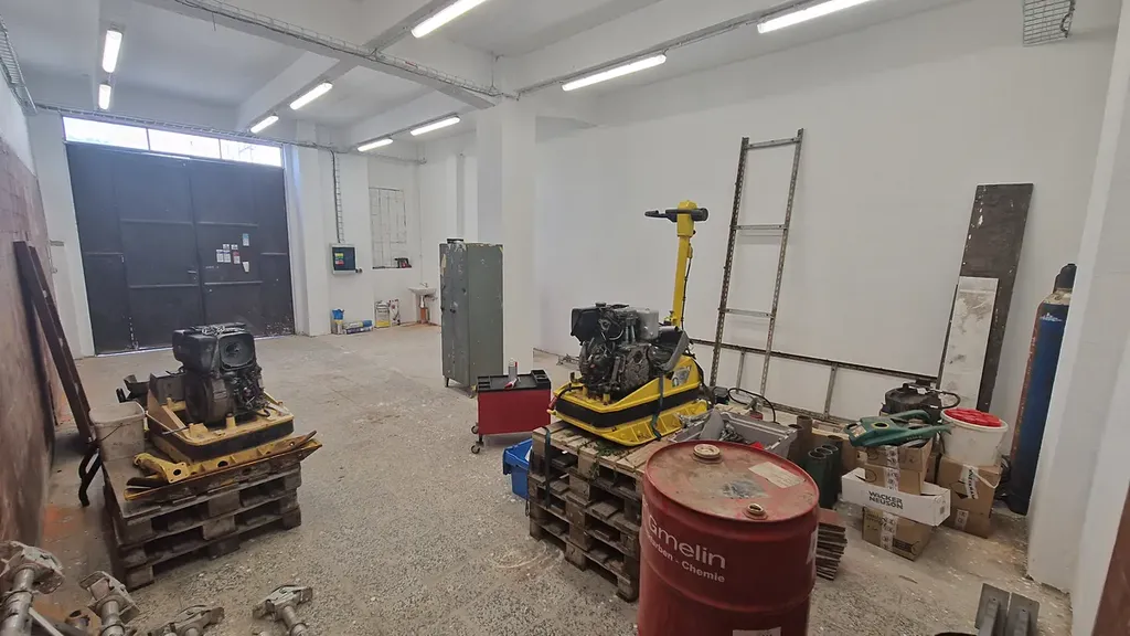Vchod případně vjezd železnými vraty 2,9m x 3,6m. Vhodné i pro hlučnější výrobu. Je možné vysoké zatížení betonové podlahy. V prostoru je k dispozici rozvod napětí 230/400V, osvětlení, zásuvky, voda, odpad, internet.