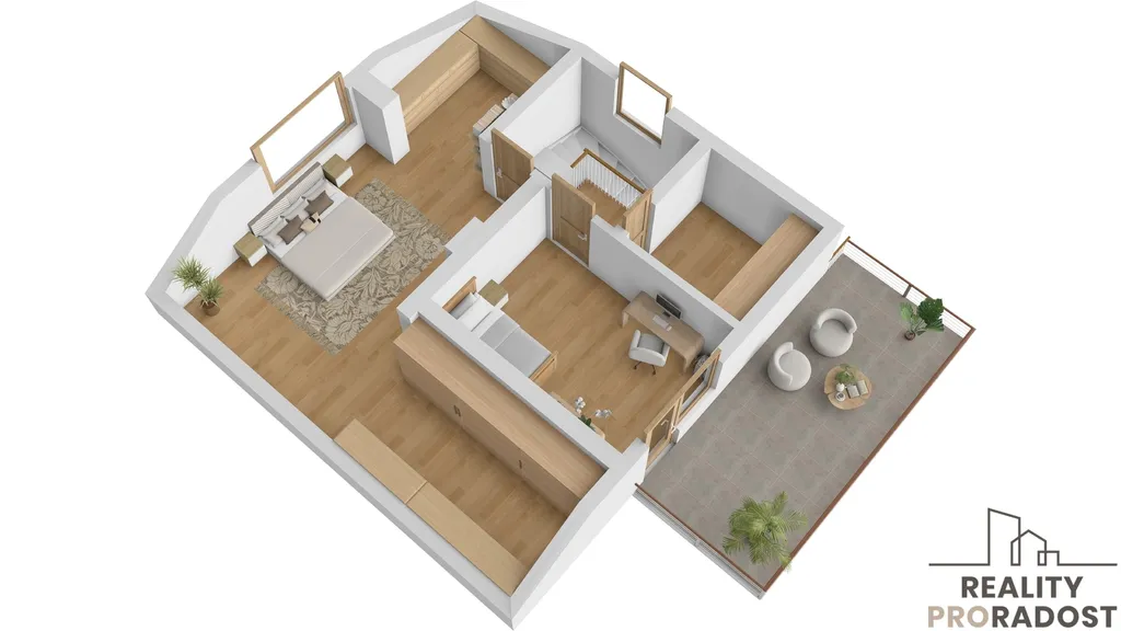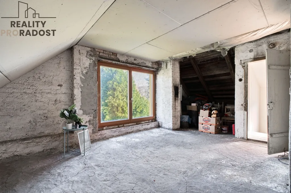 V patře jsou 2 pokoje k dokončení. Jeden s velkou terasou, kde je třeba položit podlahu a je téměř hotovo. Ve druhém pokoji je toho k dokončení více. Malá místnost v patře je pak ideálním místem ke zbudovaní další koupelny.