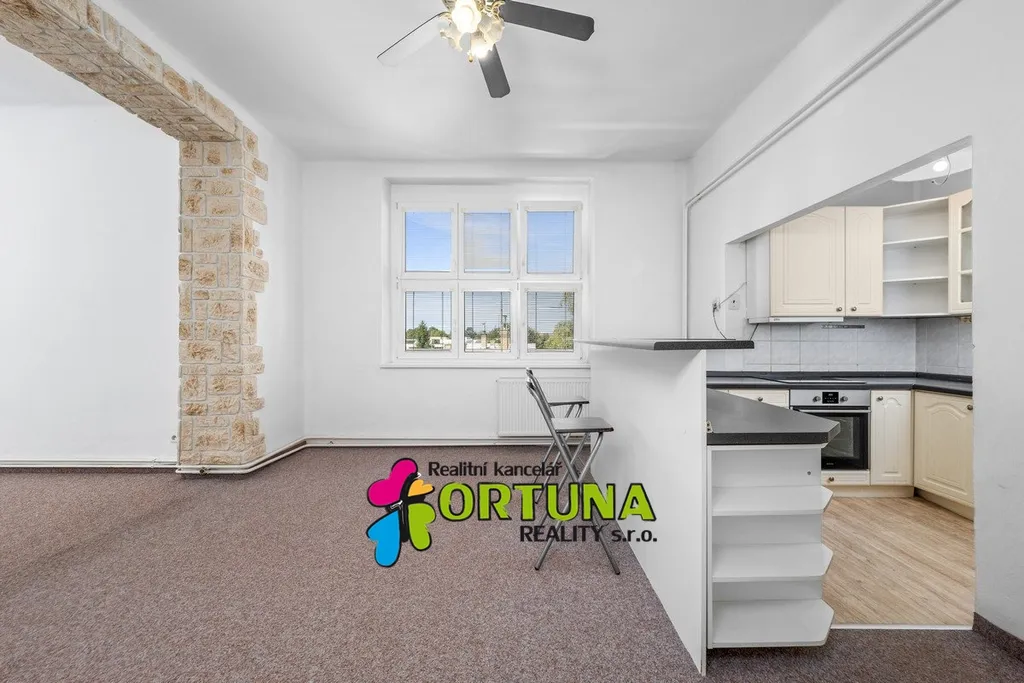 Byt je situovaný ve čtvrtém patře zděného domu bez výtahu. Ze vstupní chodby je vstup do WC, do šatny a dále pak do obývacího pokoje s kuchyňským koutem.