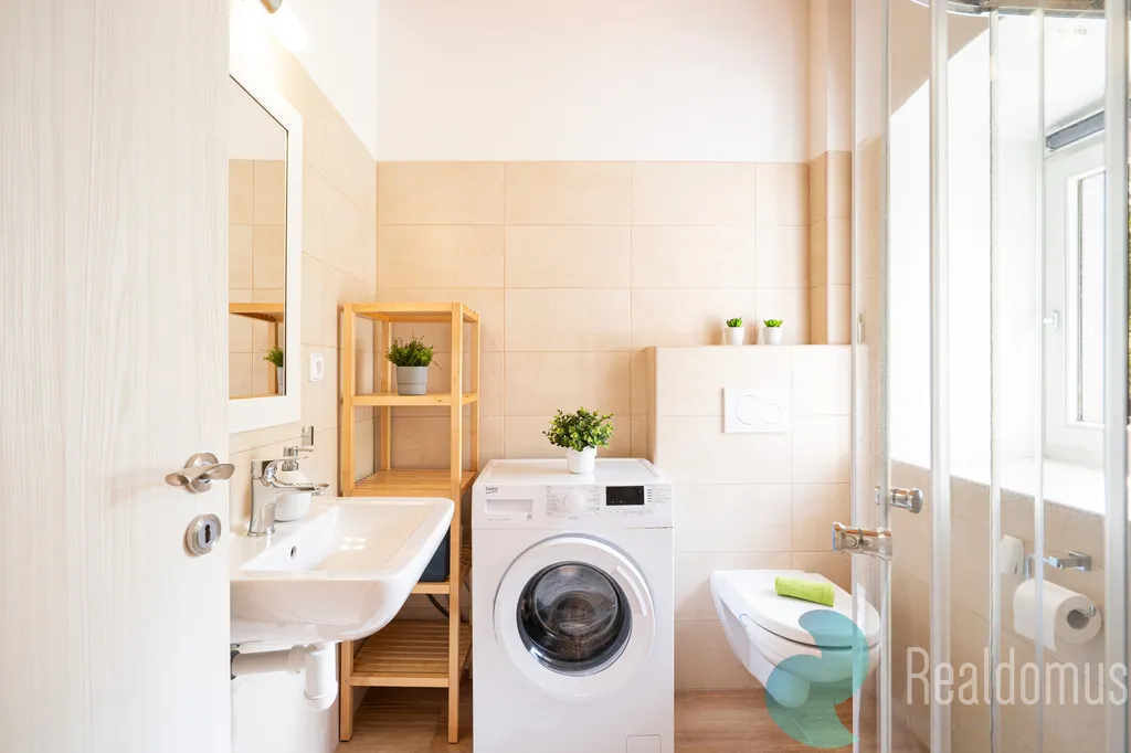 – Koupelna se sprchovým koutem, WC a pračkou