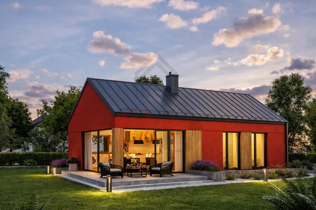 Moderní přízemní rodinný dům s promyšlenou dispozicí nabízí komfortní, úsporné a praktické bydlení pro rodinu.