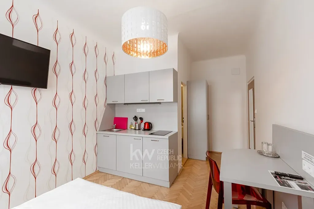 V krásné prvorepublikové vile k pronajme plně vybavené studio hned vedle parku a divadla Na Jezerce. Studio je vybaveno kuchyňskou linkou včetně lednice s mrazákem, varnou deskou a základním kuchyňským vybavením (příbory, talíře atd.). V koupelně je sprchový kout, WC a fén. Samotný pokoj je vybaven šatní skříní, televizí se satelitním příjmem, WIFI připojením, stolem, židlemi a postelí.