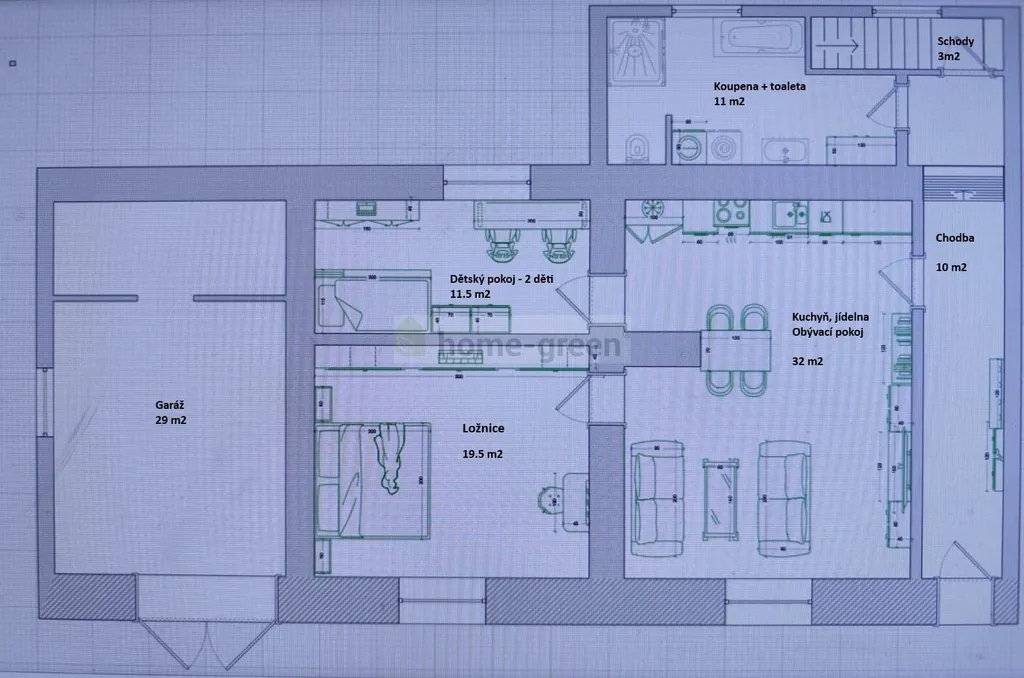 K domu je přistavěná garáž o velikosti užitné plochy 29 m2, ve které je možné oddělit stěnou samostatný vstup z ulice a schodiště do podkrovního bytu.