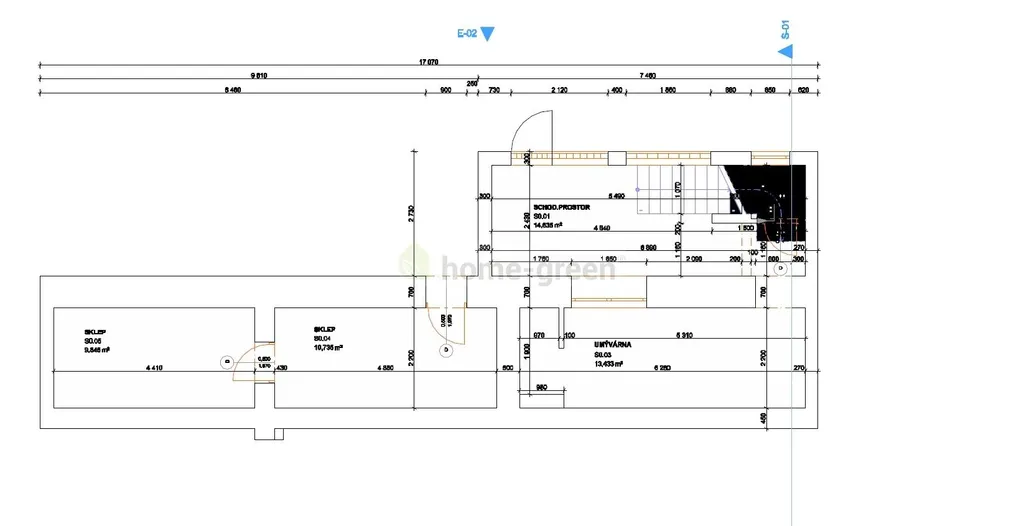 V 1.NP potom vybudovat na obytné ploše 32 m2 jeden pokoj, sprchu, WC a chodbu s východem na oplocenou zatravněnou zahradu. V zahradě je vchod do dvou sklepních místností.