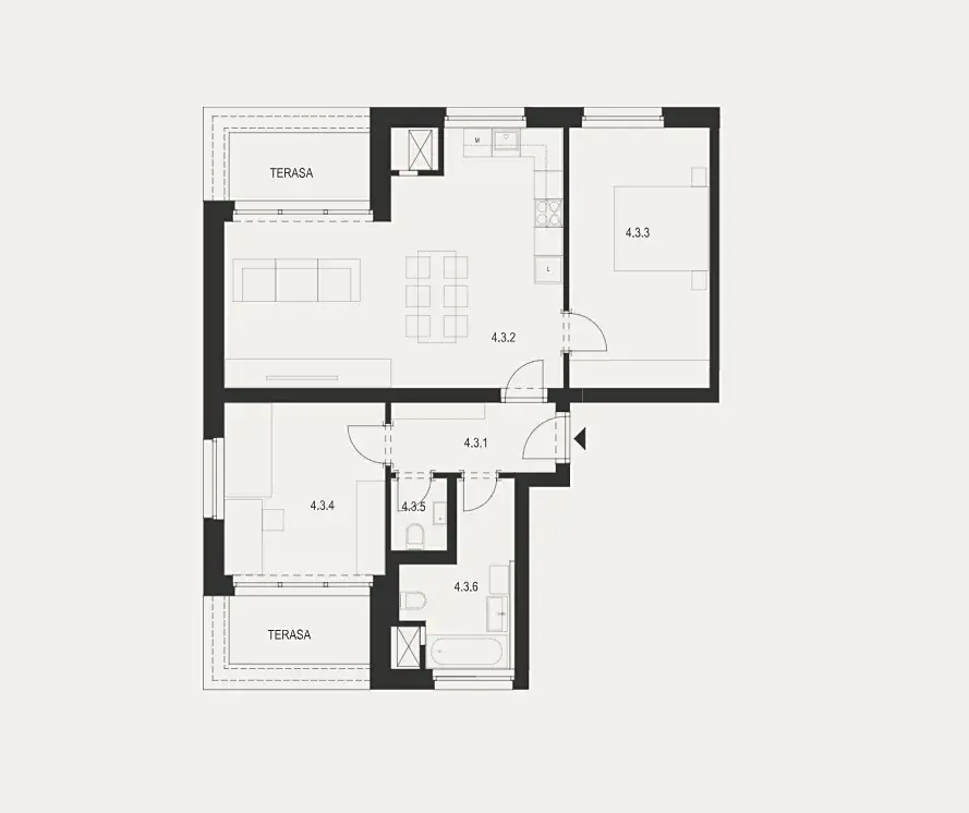 Předmětem nabídky je byt 3+kk s dvěma terasami (8,7 m2), který nabízí výměru o podlahové ploše 86,44 m2. Dispozičně se člení na účelnou vstupní chodbu, koupelnu s vanou, umyvadlem a WC, samostatnou toaletu s umyvadlem, ložnici se vstupem na terasu, dětský pokoj a hlavní obytnou místnost s kuchyňským koutem se vstupem na druhou terasu. Byt je orientovaný na jihovýchod a částečně na severovýchod. Díky velkým balkonovým dveřím na terasy je v bytě dostatek přirozeného světla. Velkým benefitem je podélné okno v koupelně, které zajistí dostatek světla i odvětrání a praktická přizdívka u umyvadla. Dvě terasy nabízejí příjemný odpočinek po celý rok a výhled z výšky do krajiny.