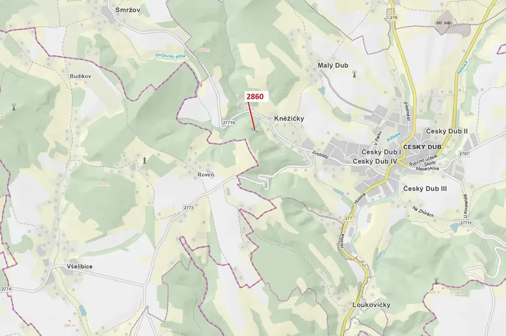 Lesní pozemek o výměře 662 m2, parcelní číslo 2860, podíl 1/1, katastrální území Český Dub, obec Český Dub, obec s rozšířenou působností Liberec, okres Liberec, Liberecký kraj. Po těžbě.