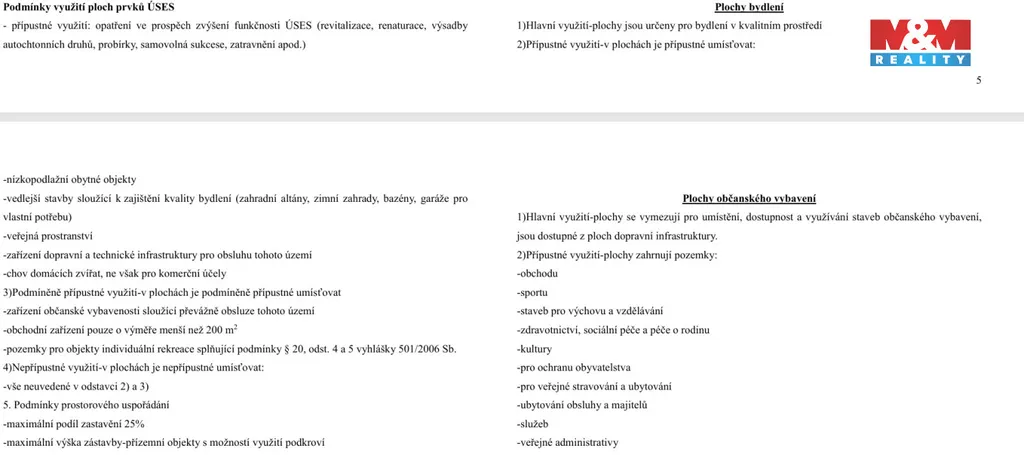 Možnost stavby přízemního rodinného domu s obytným podkrovím. K pozemku je možnost koupit již vypracovaný projekt na přízemní bungalov. Přes pozemek vede nízké napětí, což znamená, omezené využití části pozemku vzhledem věcnému břemeni. Elektřina je na hranici pozemku. Pozemek je situován pouhé 4 km od centra Rokycan a nabízí snadný přístup k dálnici D5 vzdálené 8 km. Prodejna COOP je v centru obce. Výhodou je také blízkost vlakové stanice a autobusové zastávky, což zajišťuje výbornou dopravní dostupnost.