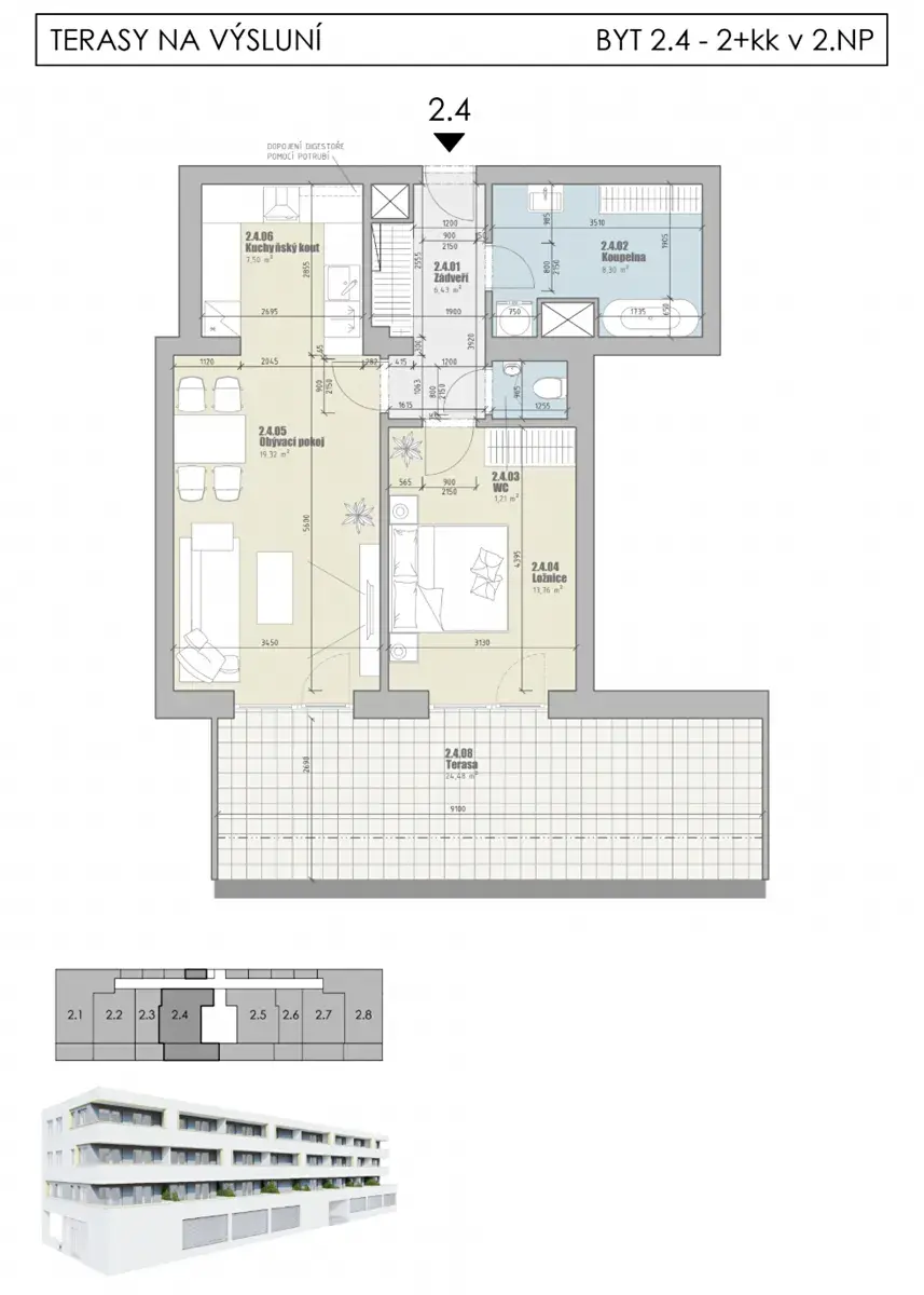 Byt disponuje prostornou terasou, která poskytuje příjemný prostor k relaxaci a posezení a je přístupná z obou obytných místností. Dispozičně je byt řešen jako obývací pokoj s kuchyňským koutem, samostatnou ložnicí, nadstandardně prostornou koupelnou s vanou i sprchovým koutem, samostatným WC a vstupní chodbou. Kuchyňská linka je vybavena vestavěnými spotřebiči – lednicí, myčkou nádobí, troubou, indukční varnou deskou a digestoří. Nábytek není součástí pronájmu.