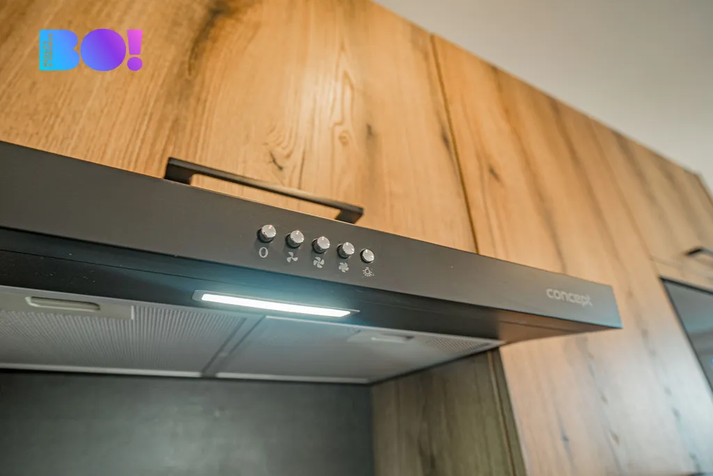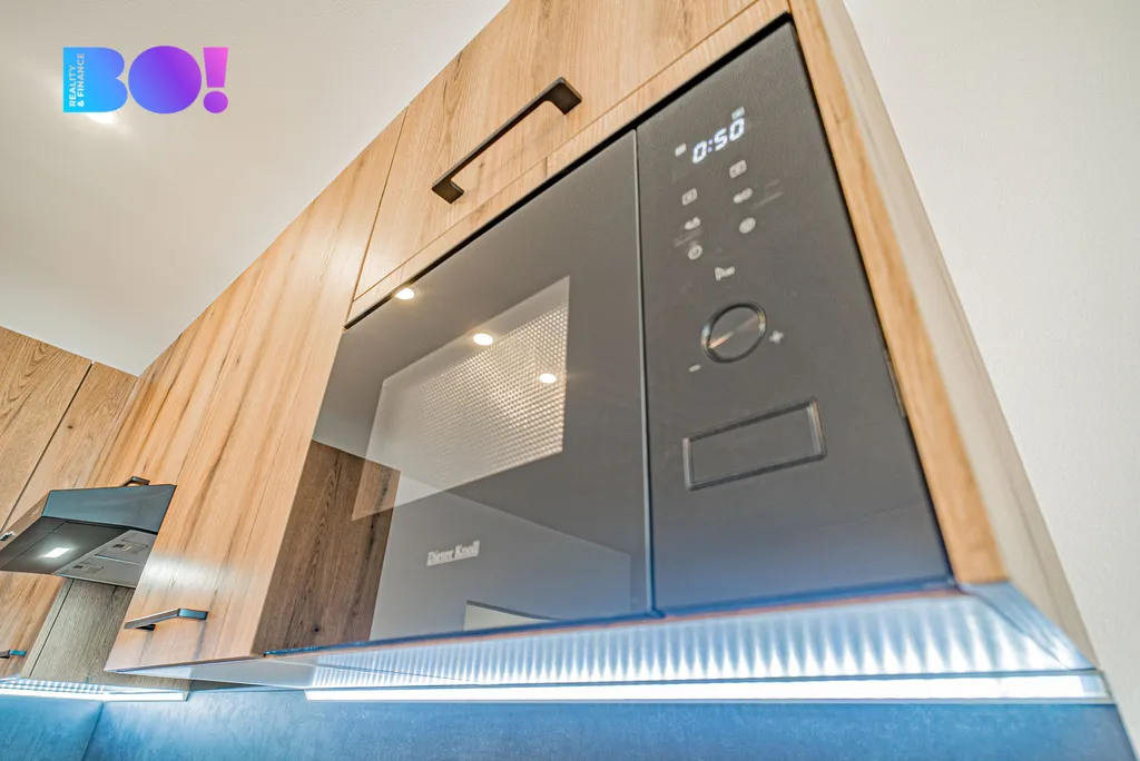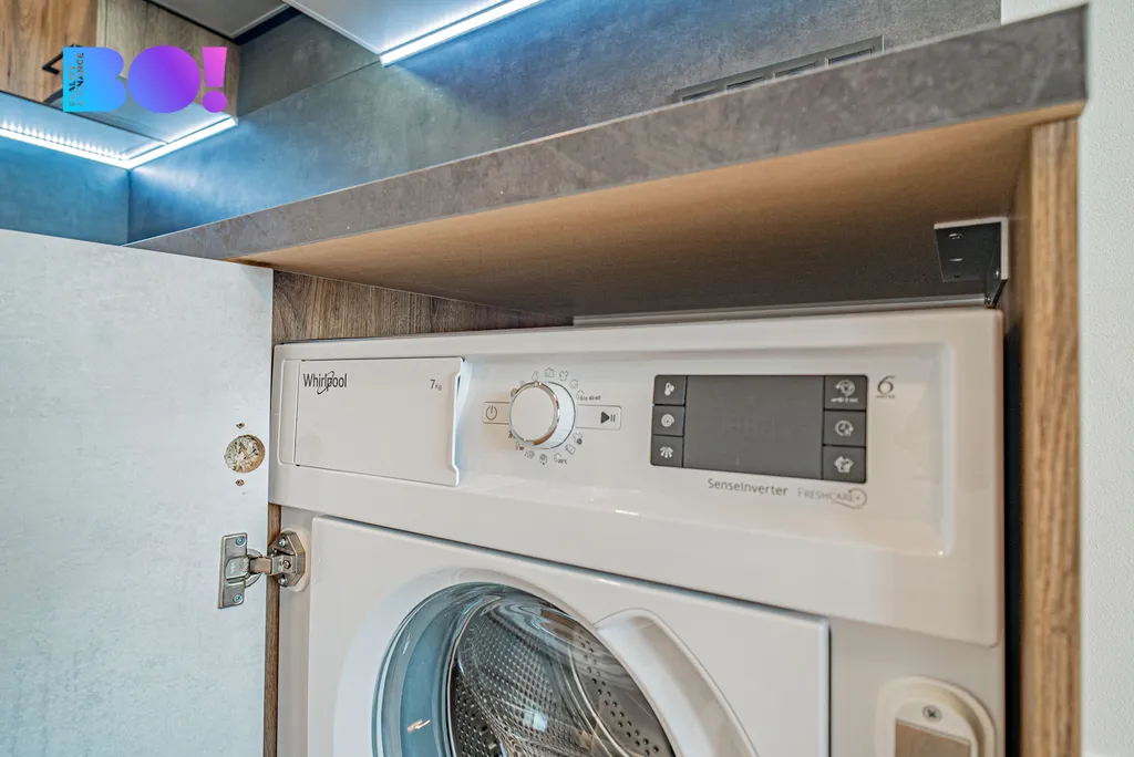 Vestavěná trouba, mikrovlnná trouba i pračka tvoří funkční řešení, které šetří místo a usnadňuje každodenní fungování.