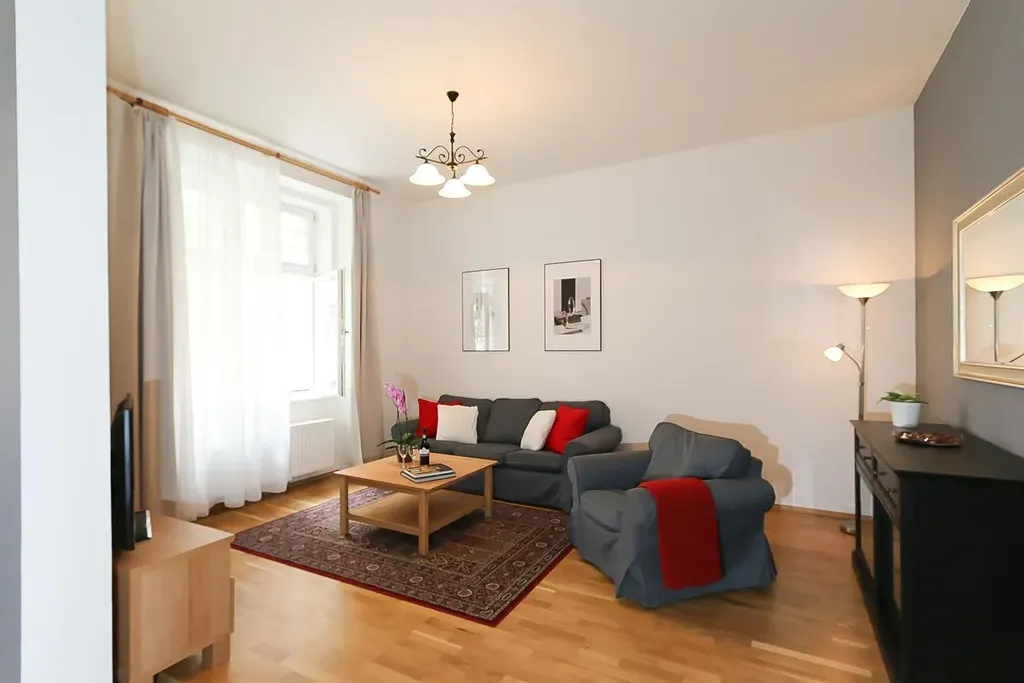 Tento světlý byt zahrnuje vstupní chodbu, prostorný obývací pokoj s jídelním koutem a kuchyňskou linkou plně vybavenou vestavěnými spotřebiči (elektrická varná deska, trouba, lednice, mikrovlnka), jednu samostatnou ložnice s okny směřujícími do klidného dvora, koupelnu se sprchovým koutem, umyvadlem, toaletou a pračkou. Mezi další příslušenství patří TV se satelitem, DVD, WiFi.