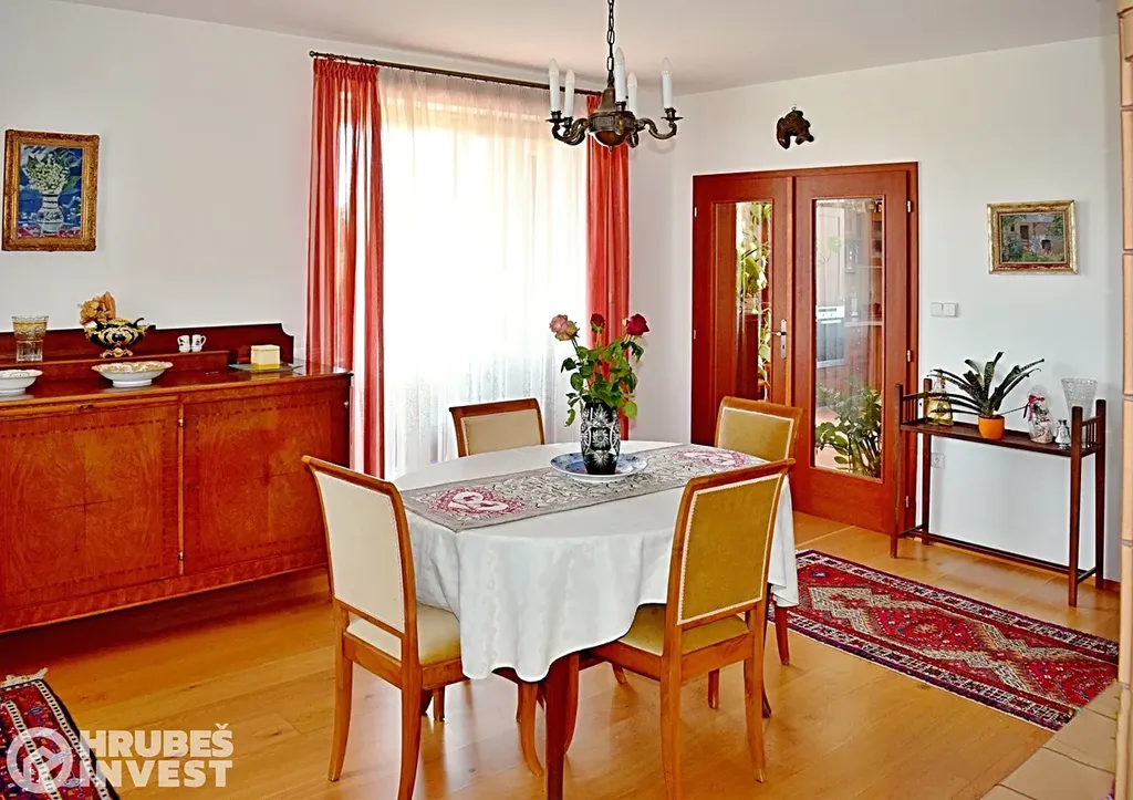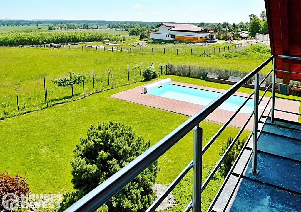 Hledáte bydlení na velmi klidném místě s nádherným výhledem, krásnou zahradou s bazénem a terasou? Pojďte se s námi podívat na krásný nadstandardní RD v obci Horní Jelení s pozemkem o výměře 1 196 m2, se zastavěnou plochou 208 m2. Dům byl kolaudován v roce 2006, jeho dispozice je 6+1, garáž, prostor pro posilovnu, nebo jiné využití pokoje se sprchou. Na zahradě je vybudován zapuštěný betonový bazén s fólií Francouzké výroby se slanou vodou a zakrytý lamelovou roletou o rozměru 8m x 4m. Z domu i ze zahrady je nádherný výhled na Orlické hory a při dobré viditelnosti i na Králický Sněžník. Tento výhled Vám po vyčerpávajícím dnu dodá opět energii a úlevu. Okna jsou plastová s dvojskly od výrobce Finstrál, konstrukce je z cihel Porotherm 43cm, střešní krytina Tondach, letos byla vybudována nová terasa z dřevěného kompozitu. Voda je obecní, odpady jsou svedeny do kanalizace, o topení se stará plynový kondenzační kotel s podlahovým vytápěním. V Obci je kompletní občanská vybavenost, vzdálenost do Holic 12 min., do Vysokého Mýta 15 min., do PU 25 min a do HK 30 min.