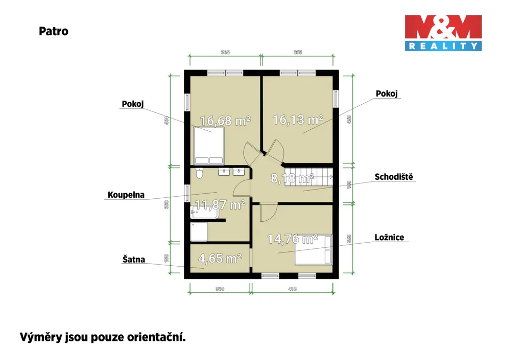Ve druhém poschodí se nachází tři ložnice, z nichž jedna má dokonce vlastní šatnu. Najdeme zde také prostornou koupelnu se zděným sprchovým koutem.