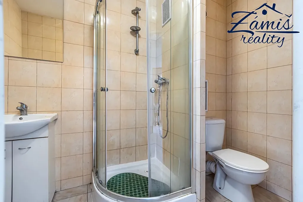 V bytě je koupelna se sprchovým koutem, umyvadlem a místem na pračku, propojená s WC, dva pokoje a kuchyňský kout s elektrickým sporákem.