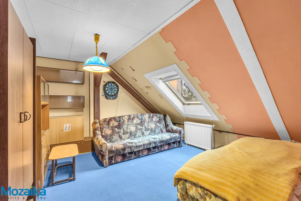 Co se týče dispozičního řešení, dům nabízí velmi zajímavou a praktickou koncepci. V suterénu najdete menší sklep, který poslouží k uskladnění potravin, sezónních věcí nebo jako technické zázemí. Přízemí je navrženo jako plnohodnotný obytný prostor s chodbou, samostatným WC, spižírnou, kuchyní, obývacím pokojem a ložnicí. Přístavba v přízemí pak nabízí koupelnu, další chodbu a praktické dveře vedoucí přímo do zahrady, což je ideální pro letní měsíce nebo pro rodiny s dětmi. V podkroví se nachází další obytná část s chodbou, která je nyní využívána jako kuchyň, a dva samostatné pokoje. K dispozici je také půdní prostor, který lze v budoucnu využít například jako další úložné prostory nebo jej případně zrekonstruovat na další obytnou místnost.