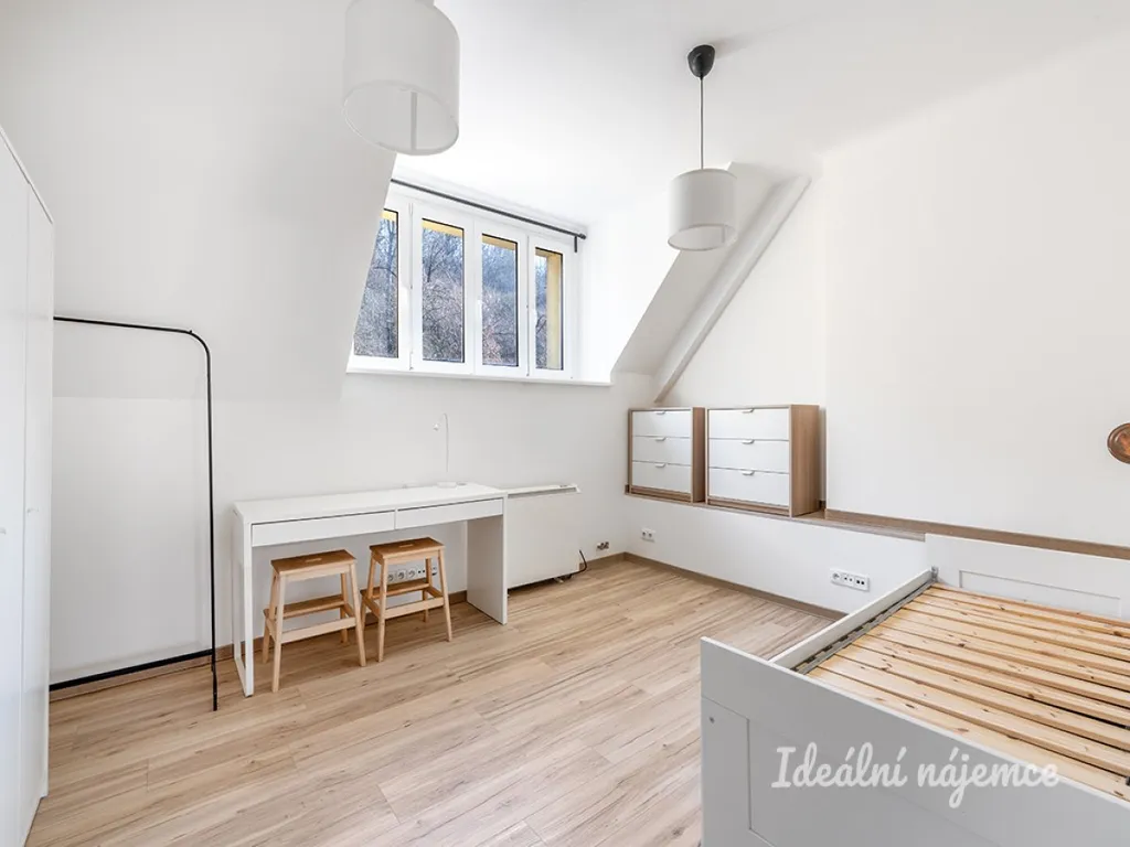 K dlouhodobému pronájmu nabízíme hezký podkrovní byt 2+kk o rozloze 46 m2 ve 4. patře cihlového domu v klidné rezidenční lokalitě pražského Podolí.
