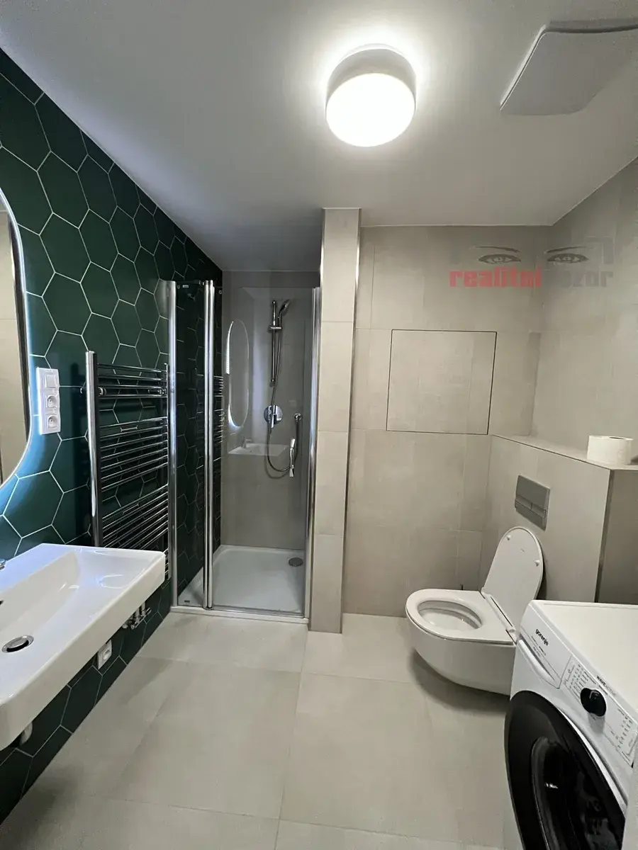 Koupelna: sprchový kout, umyvadlo, WC, designové zrcadlo, pračka, topný žebřík, velkoformátová dlažba + obklad typ hexagon